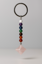 O Chaveiro Estrela de Quartzo Rosa é feito à mão com pedra natural, preservando toda a sua energia vibracional.
