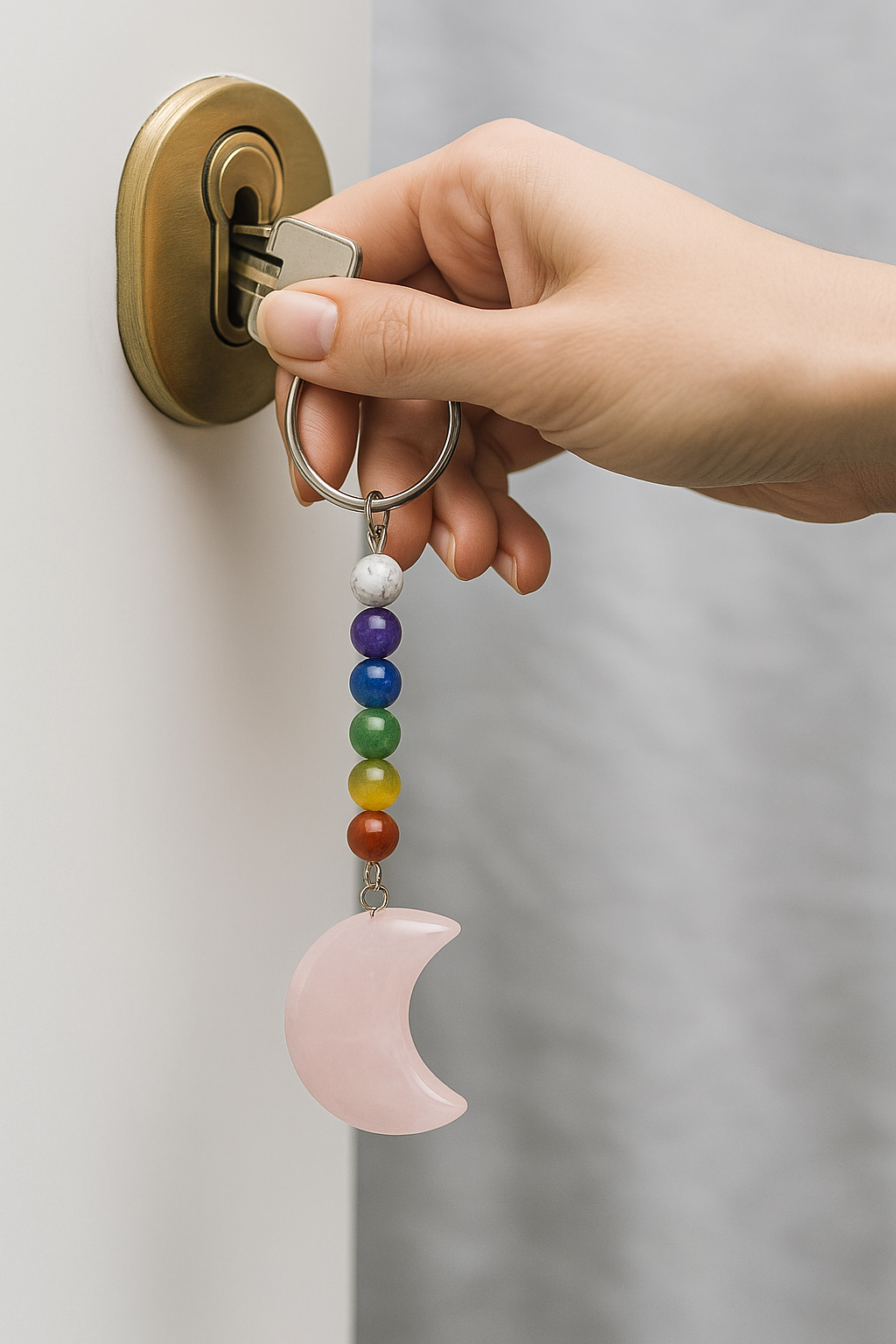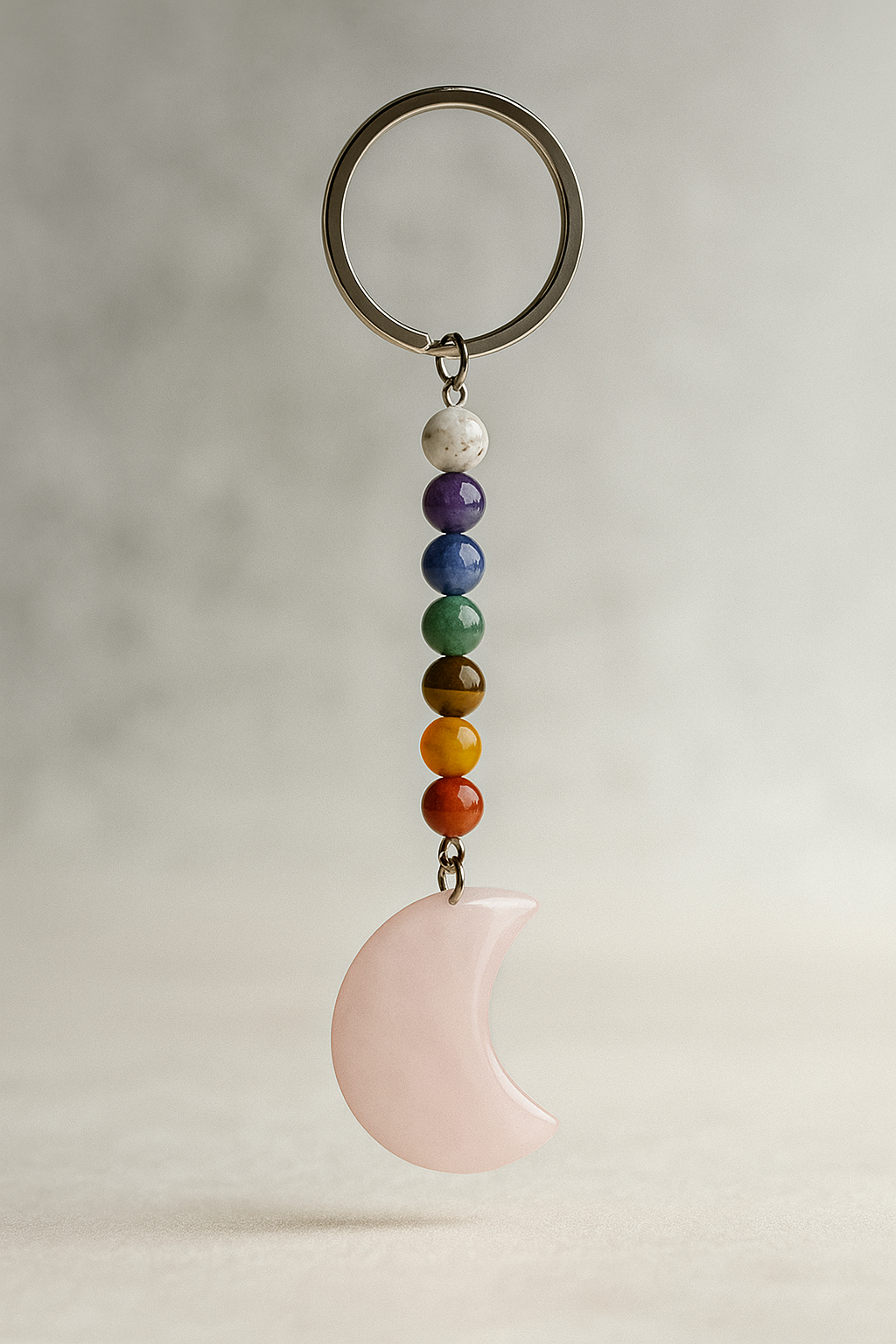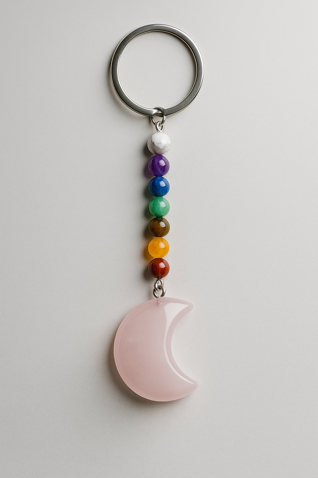 O Chaveiro Lua de Quartzo Rosa é um símbolo de autocuidado e energia emocional positiva. O Quartzo Rosa, conhecido como o cristal do coração, irradia vibrações de amor, harmonia e aceitação.
