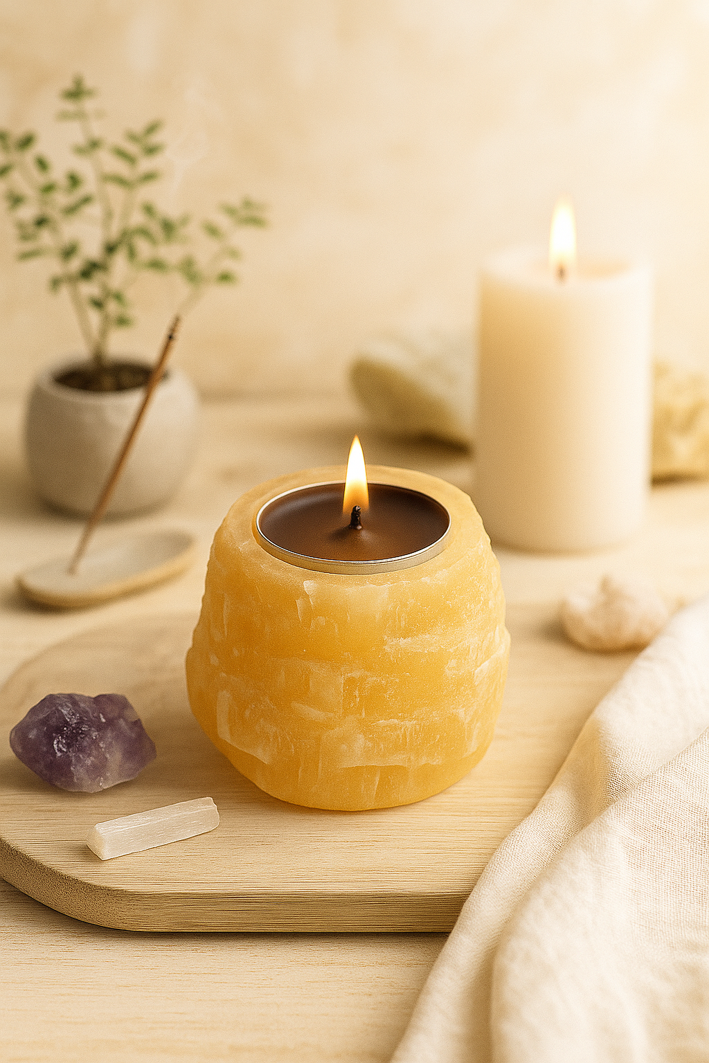 O Porta-Velas em Selenita Laranja é ideal para quem busca luz, equilíbrio e renovação.