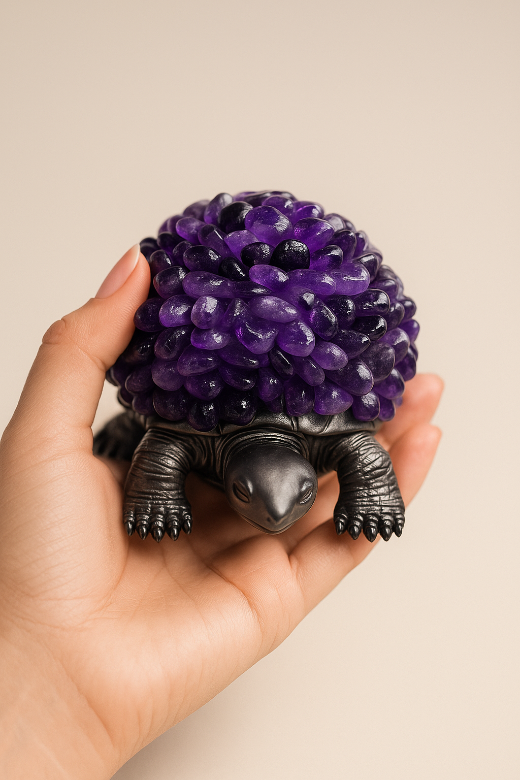 A tartaruga simboliza proteção, sabedoria e longevidade, e quando unida à energia da Ametista, cria um campo poderoso de paz interior, equilíbrio emocional e transmutação energética.