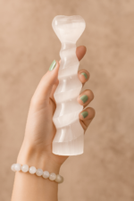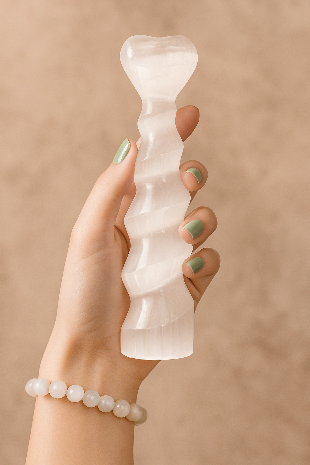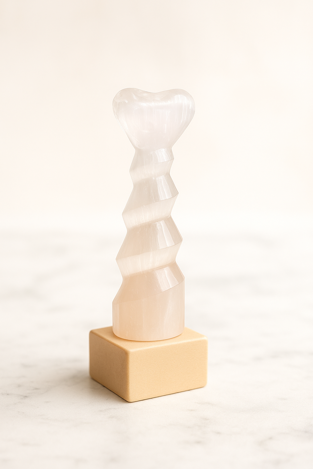 Esculpida na pedra da purificação, a Selenita, sua forma em espiral representa o fluxo ascendente da energia vital — o movimento constante entre o corpo, a mente e o espírito.