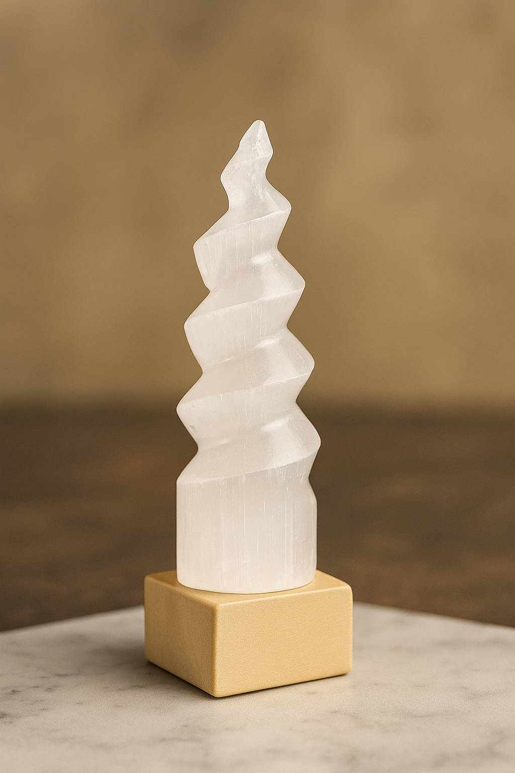Esculpida na pedra da purificação, a Selenita, sua forma em espiral representa o fluxo ascendente da energia vital — o movimento constante entre o corpo, a mente e o espírito.